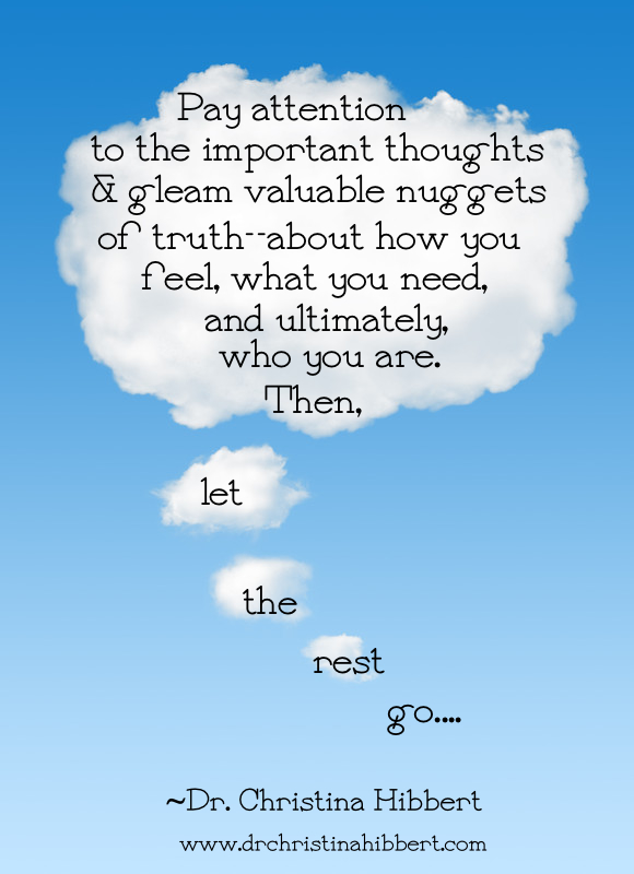 Can you see the power that listening to and altering your thoughts can have on your life? Through practice we can train ourselves to pay attention to the important thoughts and gleam valuable nuggets of truth—about how we feel, what we need, and ultimately, who we are. Then, we can let the rest go.